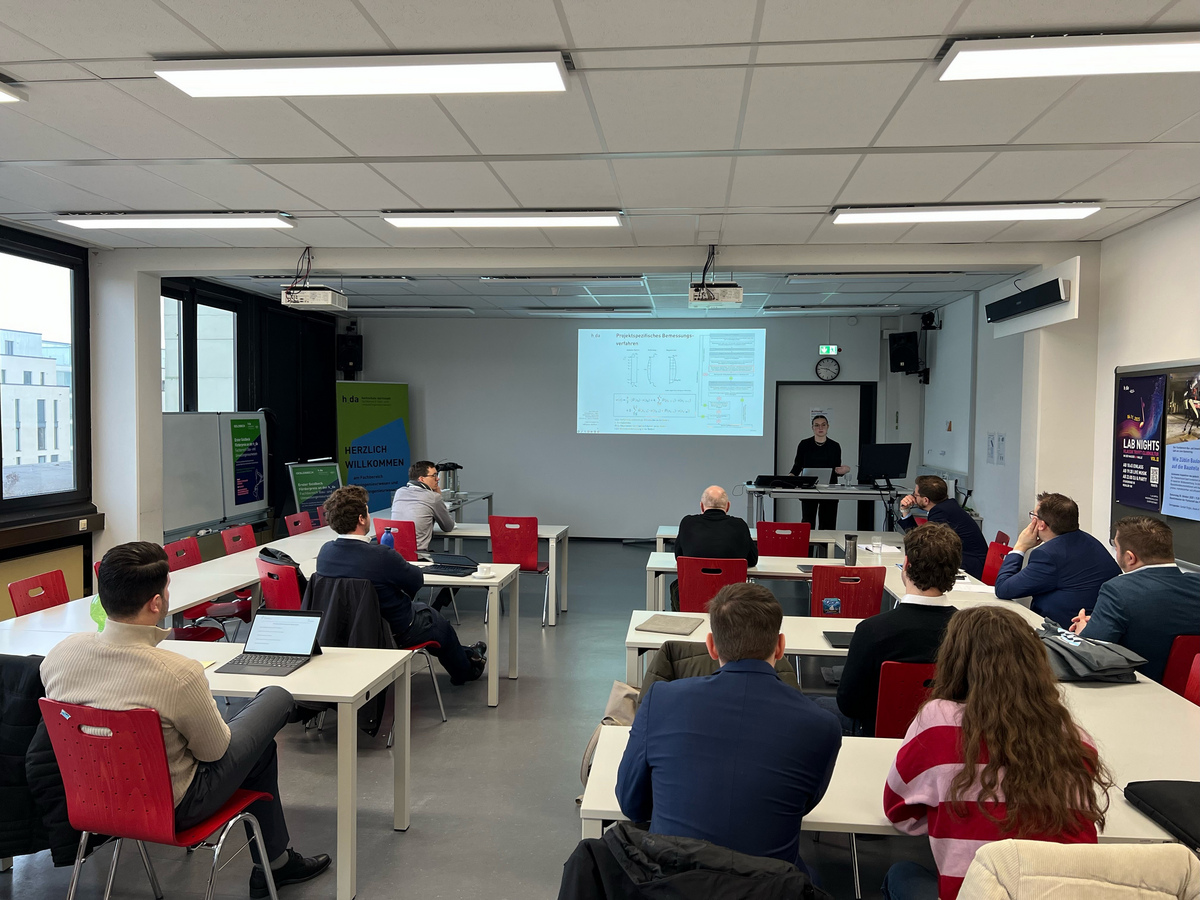Die Studierenden präsentierten am 11.02.2025 ihre Abschlussarbeit vor einem Fachpublikum am Fachbereich Bau- und Umweltingenieurwesen. Die Jury – bestehend aus zwei Professoren des Fachbereichs und zwei Vertretern der Firma Goldbeck – hatte anschließend die schwierige Aufgabe, hieraus die überzeugendste Arbeit auszuwählen.