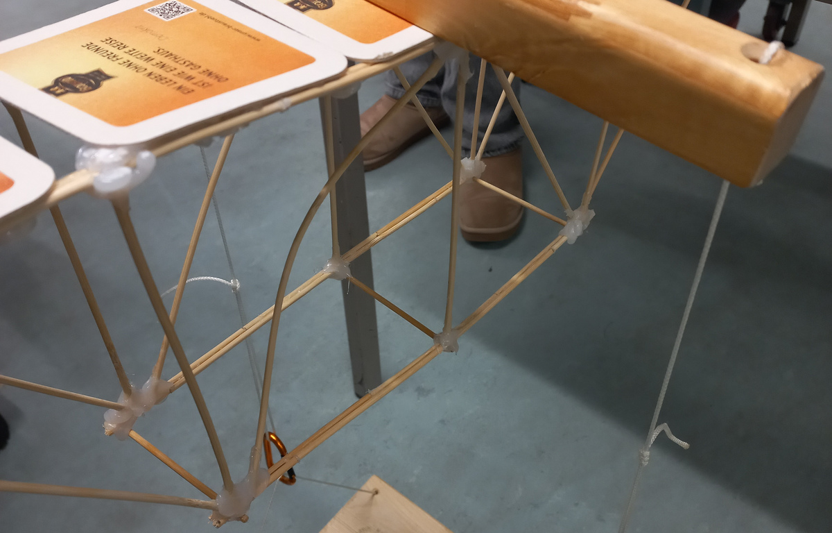 In den Räumen der Fachschaft fand der diesjährige Brückenbauwettbewerb im Modul Statik 1 statt. Aufgabe war es, eine Brücke aus Schaschlik-Spießen und Bierdeckeln zu konstruieren. Neben der Erstellung des Brückenmodells mit 50 cm lichter Spannweite, einer maximalen Bauhöhe von 20 cm sowie einem maximalen Eigengewicht von 150 g, sollte eine Abschätzung der Traglast erfolgen. Die Studierenden einer Gruppe (max. 5 Studierende) sollten hierzu ein Plakat erstellen.
