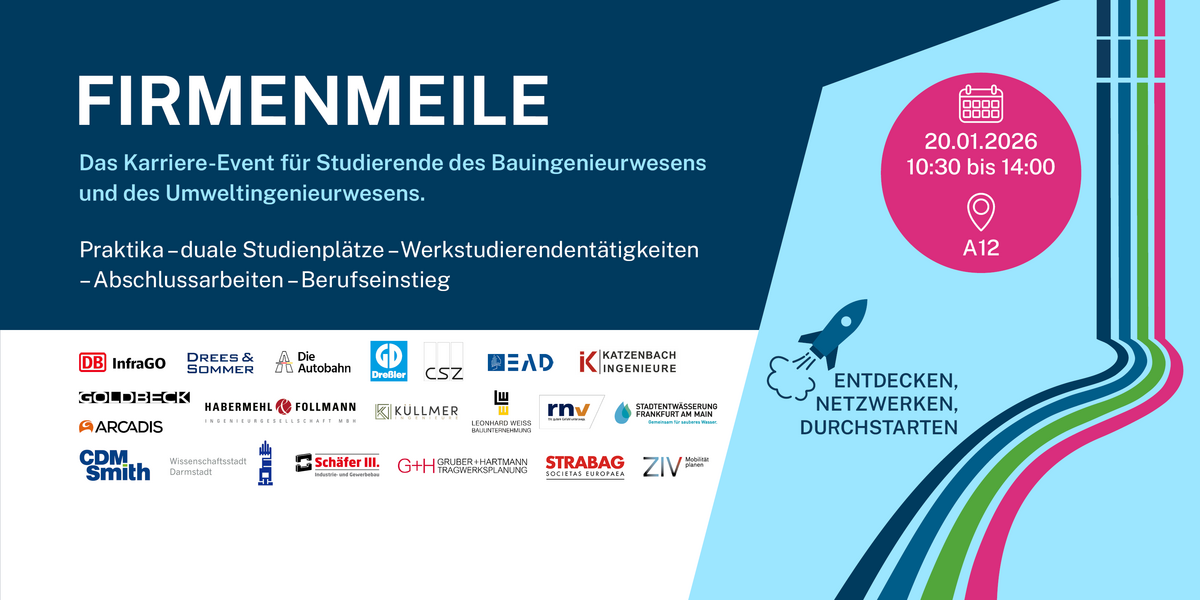 Die Firmenmeile des Fachbereichs Bau- und Umweltingenieurwesen geht am Dienstag, den 20.01.2026 von 10:30 bis 14:00 Uhr im Gebäude A12 in die dritte Runde – und wird größer denn je!